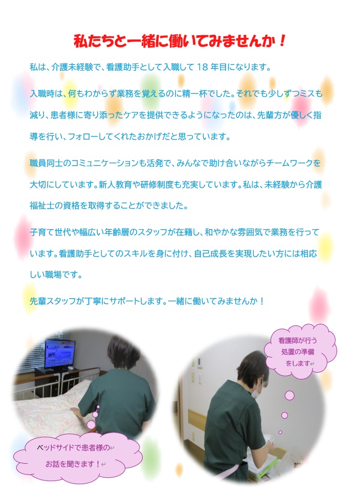 無資格の方、未経験の方多数活躍しています。新しい生活の第一歩、当院で始めませんか。担当:看護科 井上までご連絡ください。